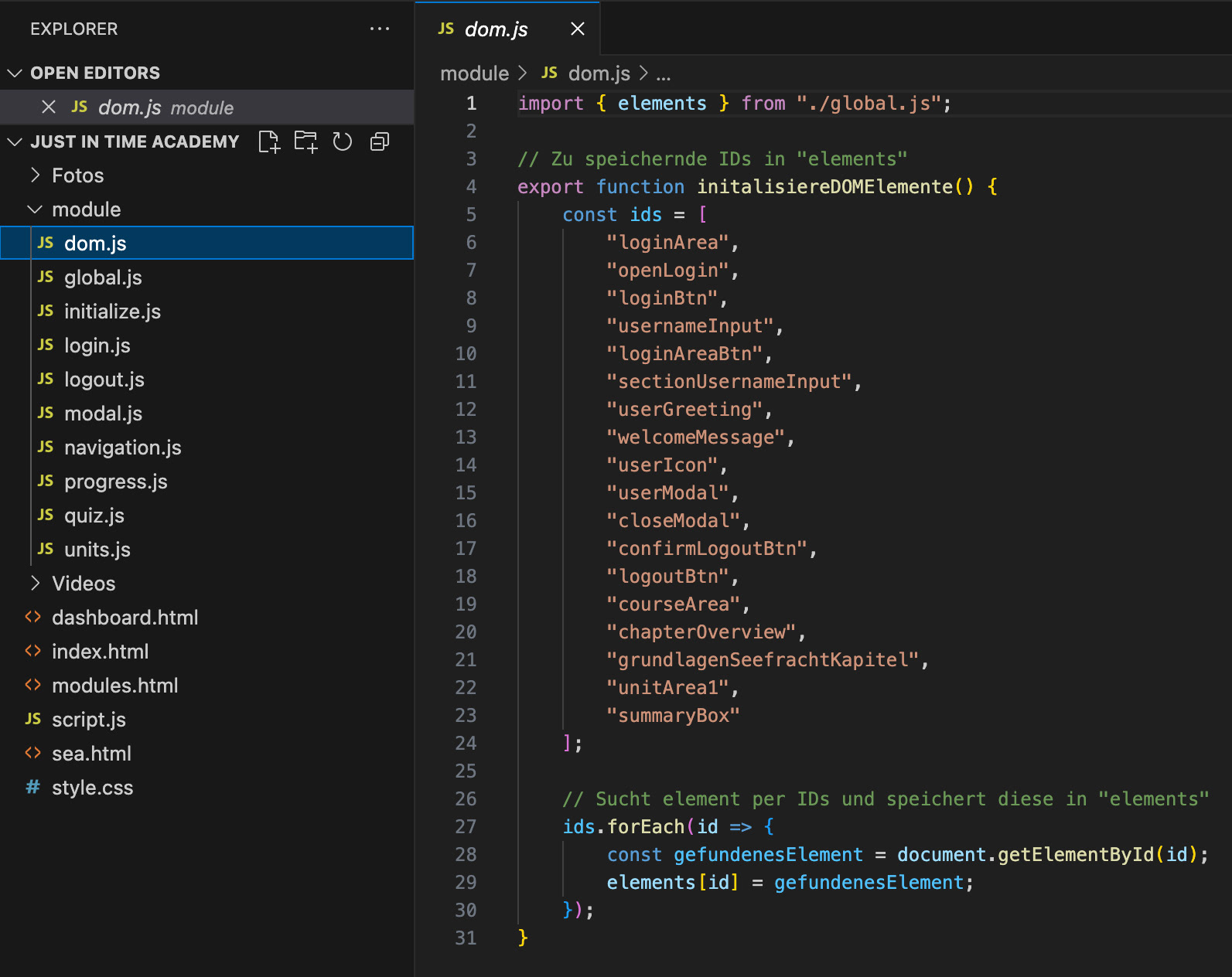Die Funktionalität der Webanwendung wurde in JavaScript umgesetzt und im Verlauf des Projekts schrittweise modularisiert, um Struktur und Wartbarkeit zu verbessern. In den HTML‑Dateien wurde anschließend nur eine zentrale script.js-Datei eingebunden, die als Einstiegspunkt dient. Durch das Attribut „type=module“ im <script> Tag der HTML-Dateien wird das Skript erst ausgeführt, nachdem das HTML vollständig geladen ist. Die Navigation zwischen bestimmten Bereichen innerhalb einer HTML‑Datei erfolgt dynamisch über JavaScript. Elemente werden ein‑ oder ausgeblendet, indem gezielt die Klasse .hidden hinzugefügt oder entfernt wird.
